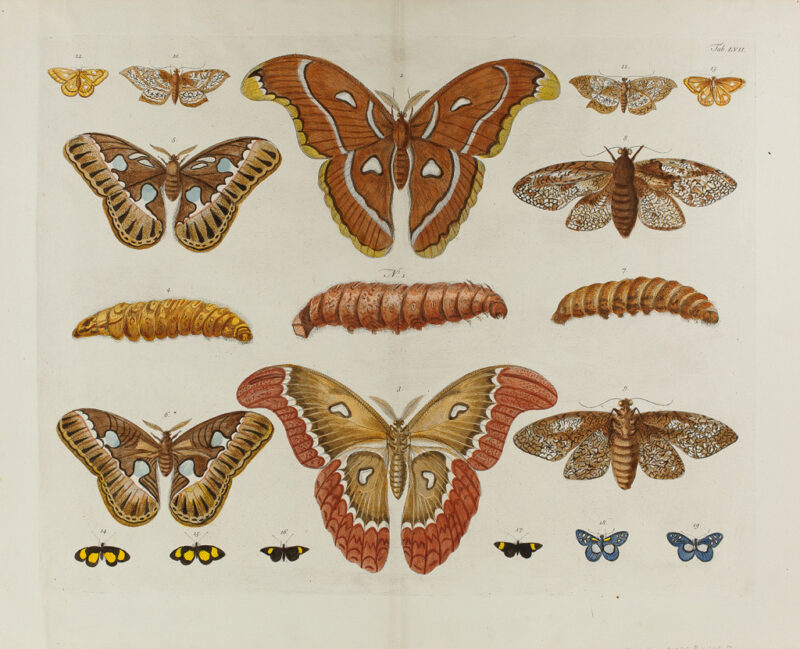The antique engravings on display date from a time when naturalists first began to identify and classify insects as a serious object of study. They were authored primarily by trained artists who became interested in moths and butterflies, raised them through metamorphosis, and recorded observations in word and image. These works published in early entomological literature display the wonderful diversity and physical forms of lepidopteran species.